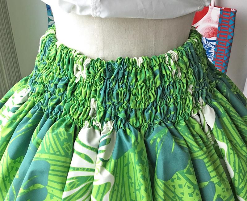 TOP > Pink Lei シングルパウ オフホワイト&グリーン・ハイビスカス柄 ウエストゴム4本 丈73cm