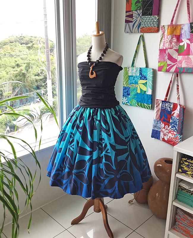 TOP > Pink Lei シングルパウ ネイビー&ブルーグラデーション・ティアレ&タパ柄 ウエストゴム4本 丈73cm