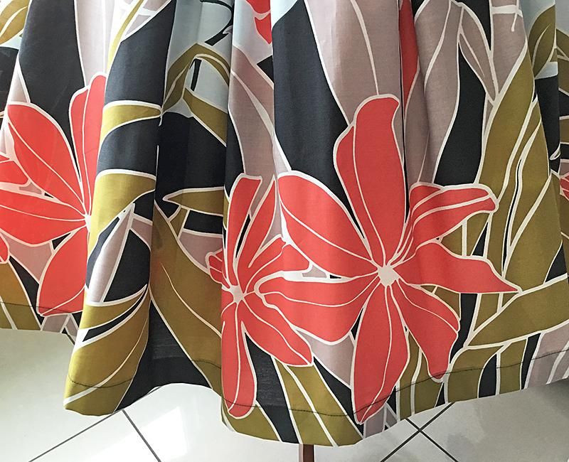 TOP > Pink Lei シングルパウ ブラック&バーミリオン&ベージュ・ティアレ&リーフ柄 ウエストゴム4本 丈73cm