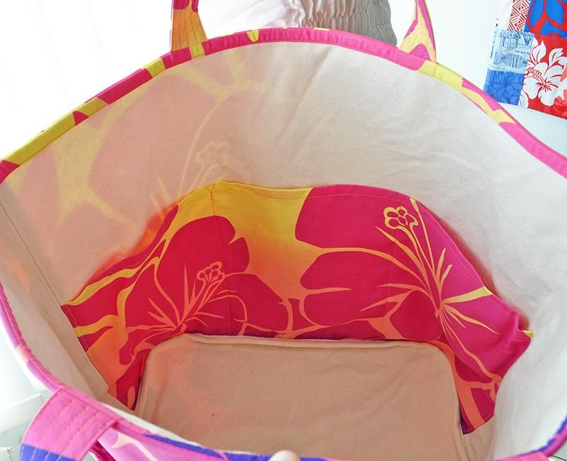 ハワイアンファブリック特有の華やかな柄が目を引くシンプルな作りながら、使いやすさ重視のこだわりをたくさん詰め込んだデザイン。