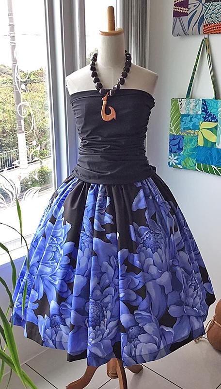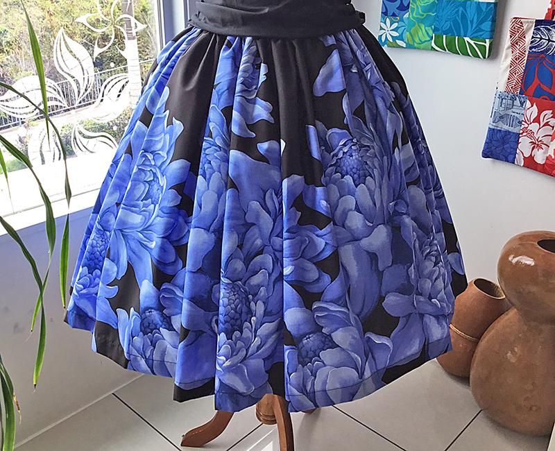 TOP > Pink Lei シングルパウ ブラック&ブルー・プロテア柄 ウエストゴム4本 丈73cm