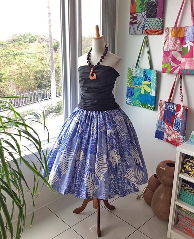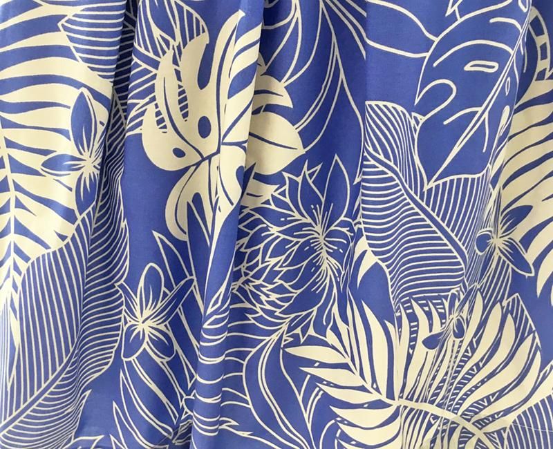 TOP > Pink Lei シングルパウ ブルー&ホワイト・トロピカルリーフ柄 ウエストゴム4本 丈73cm