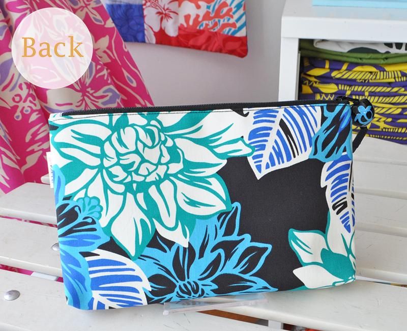 TOP > Pink Lei オリジナル【1点もの】ハワイアンマスクポーチ ブラック&ブルー&ターコイズ・ロケラニ柄