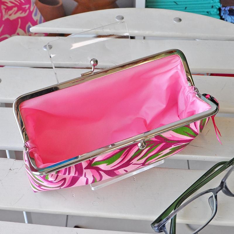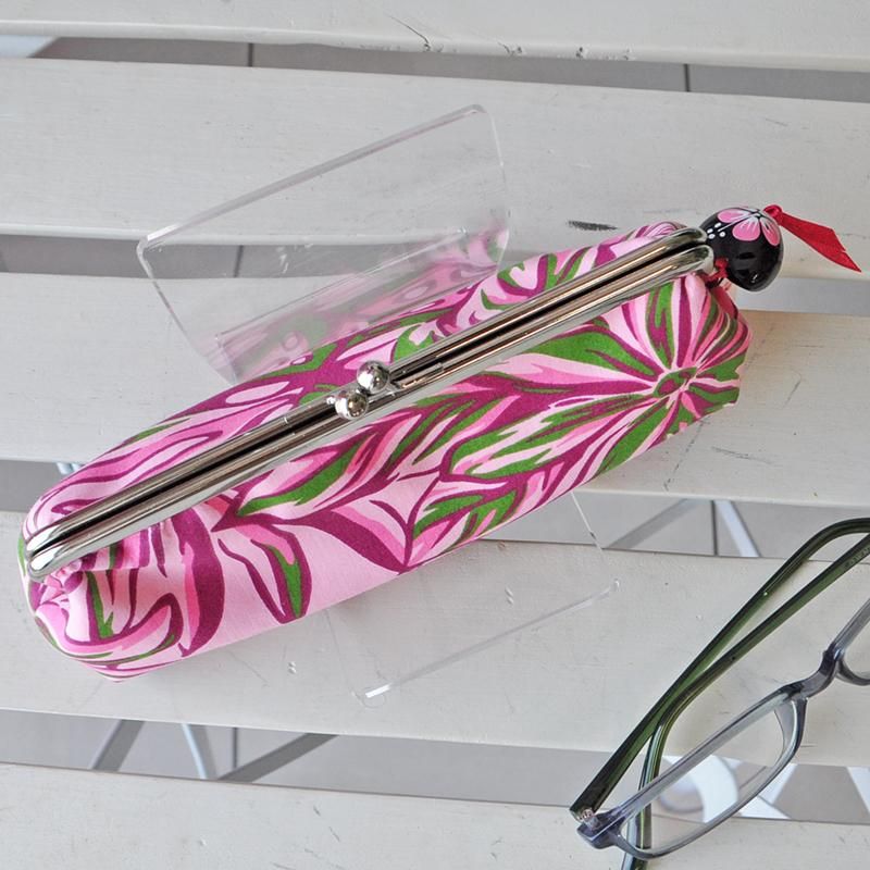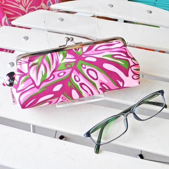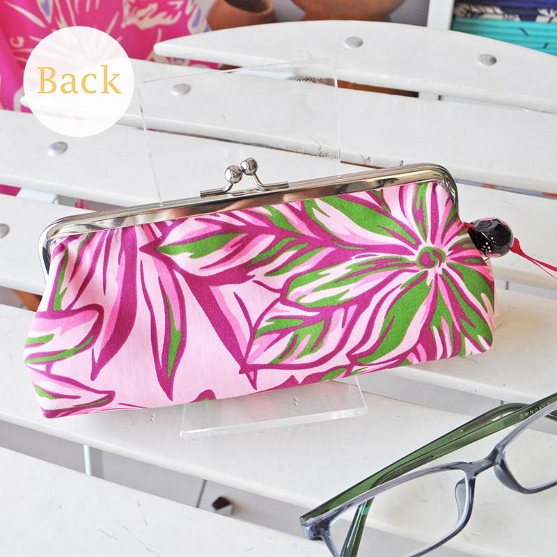 TOP > Pink Lei オリジナル【1点もの】 がま口・サングラスケース ピンクパープル&グリーン・モンステラ&ティアレ柄