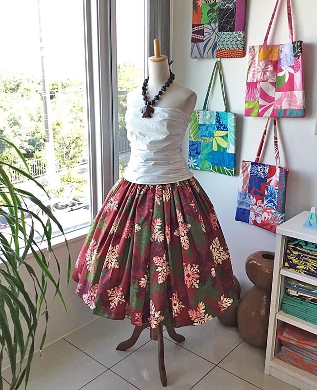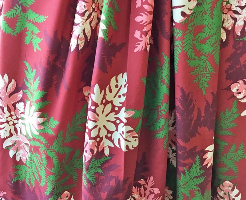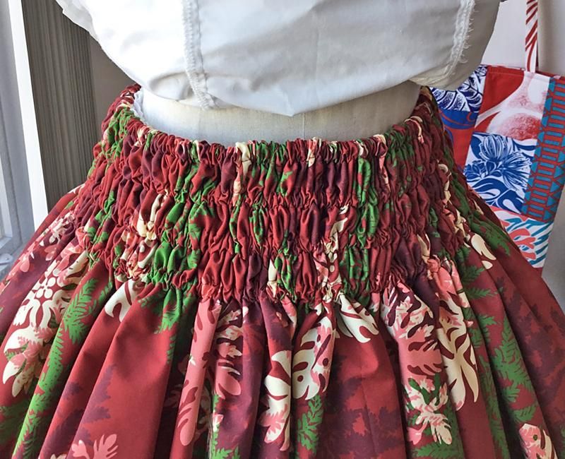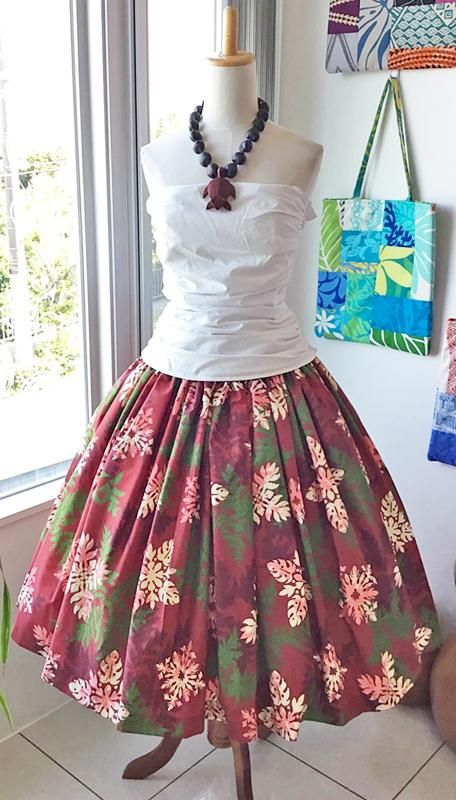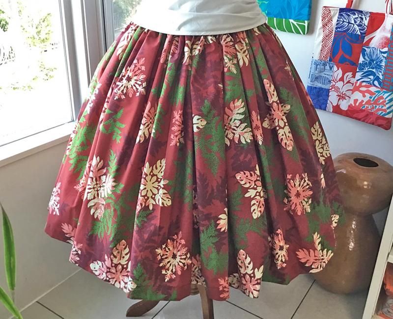 TOP > Pink Lei シングルパウ ワインレッド&グリーン&ホワイト・シダ&ハワイアンキルト柄 ウエストゴム4本 丈73cm