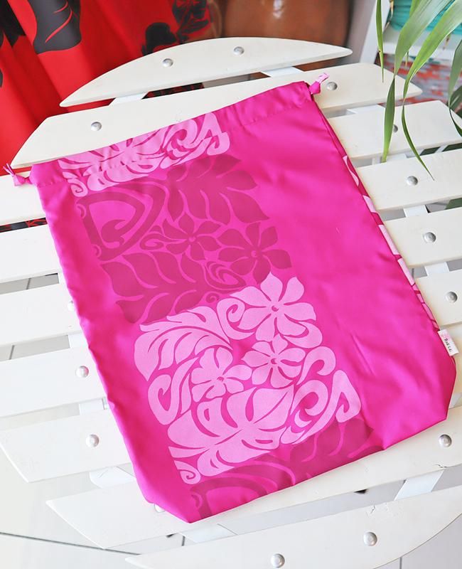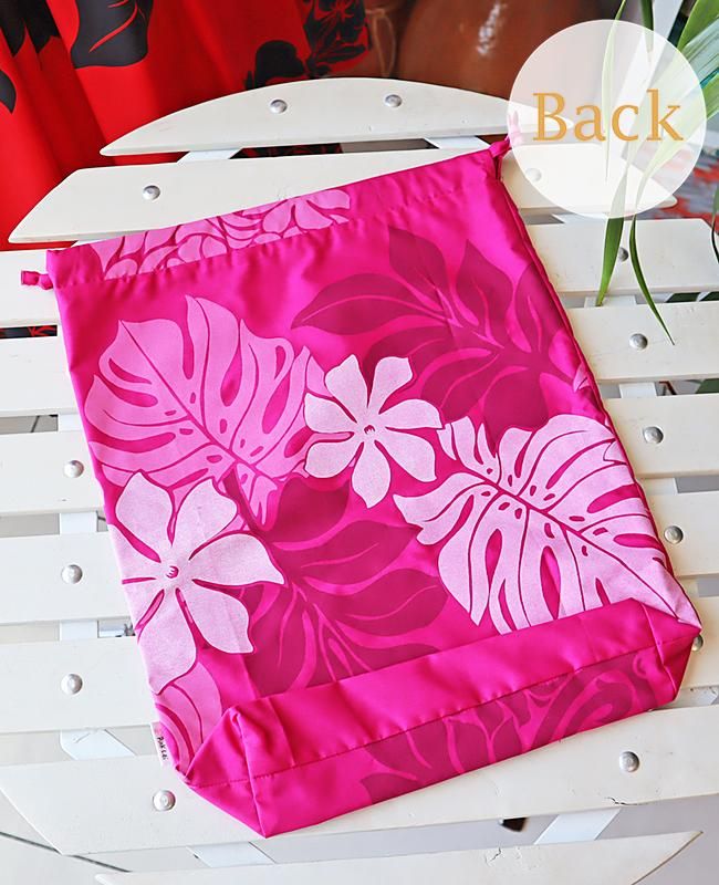 TOP > Pink Lei オリジナル 〜新商品〜 巾着袋 ホットピンク/ティアレ&モンステラ・スクエア柄【1点もの】
