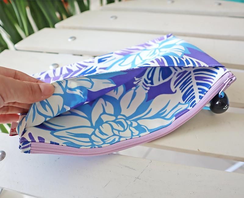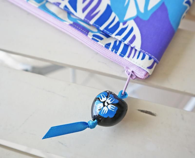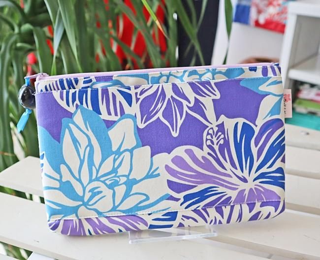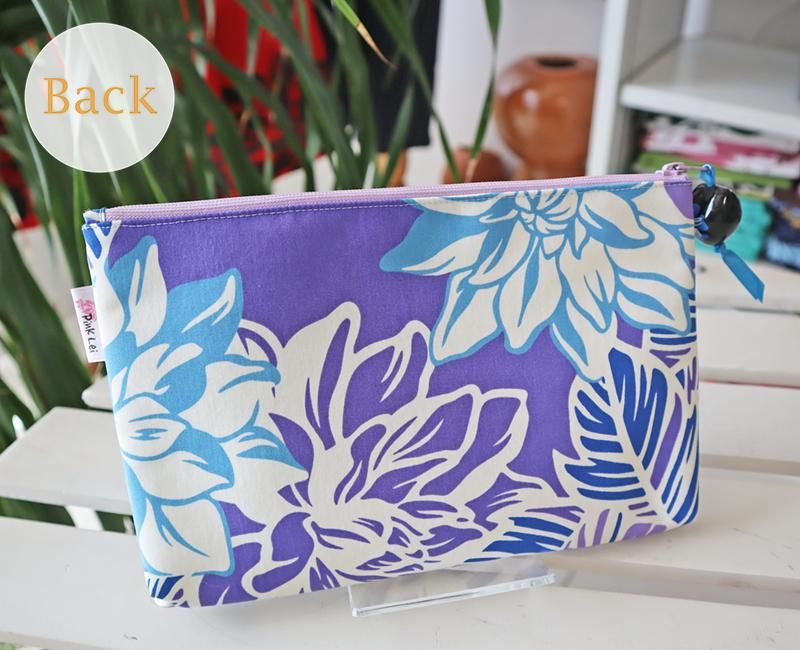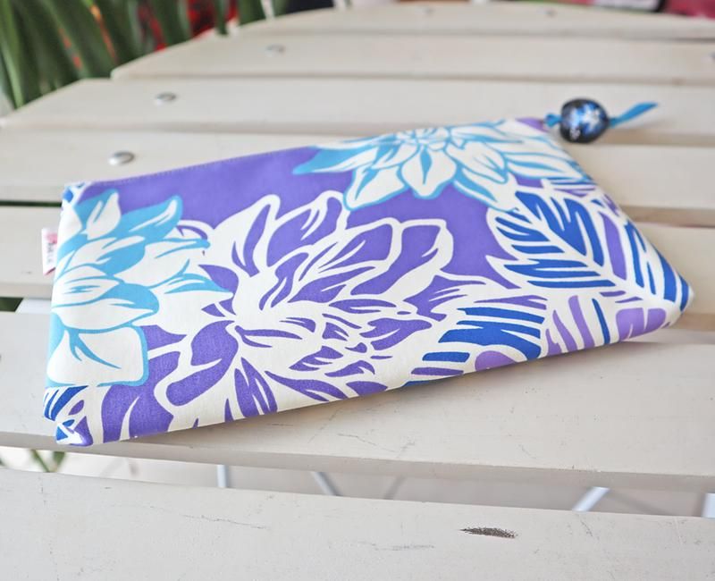TOP > Pink Lei オリジナル【1点もの】ハワイアンマスクポーチ パープル&ホワイト&ブルー・ハイビスカス&ロケラニ柄