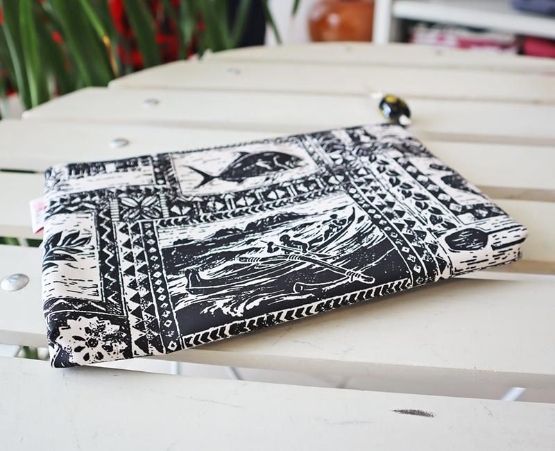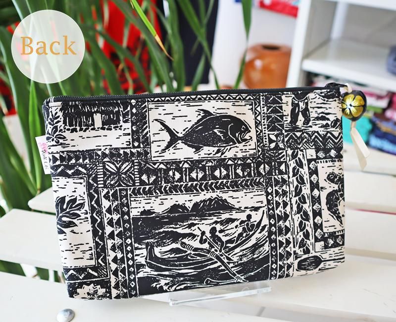 Pink Lei オリジナル【1点もの】ハワイアンマスクポーチ ブラック&ホワイト・ハワイアンモチーフ古典柄