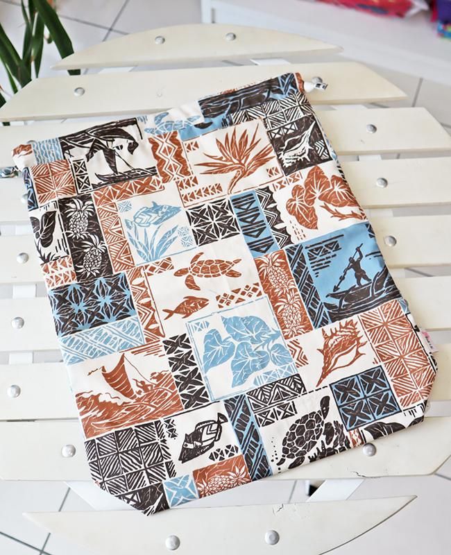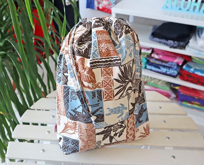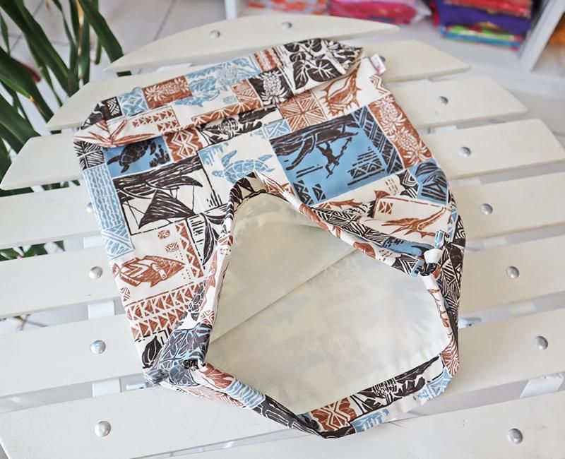 TOP > Pink Lei オリジナル 〜新商品〜 巾着袋 オフホワイト&ブラウン&ブルー・ハワイアンモチーフ古典柄【1点もの】