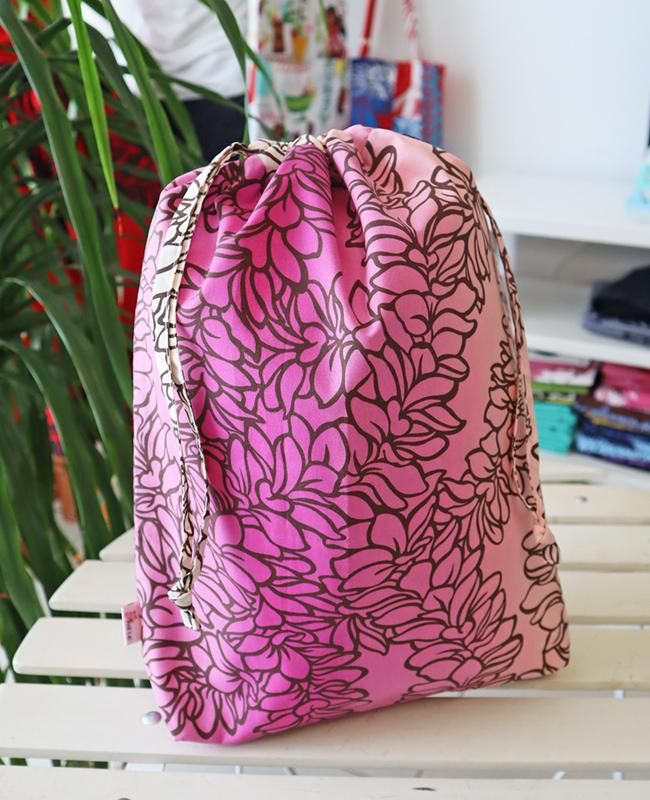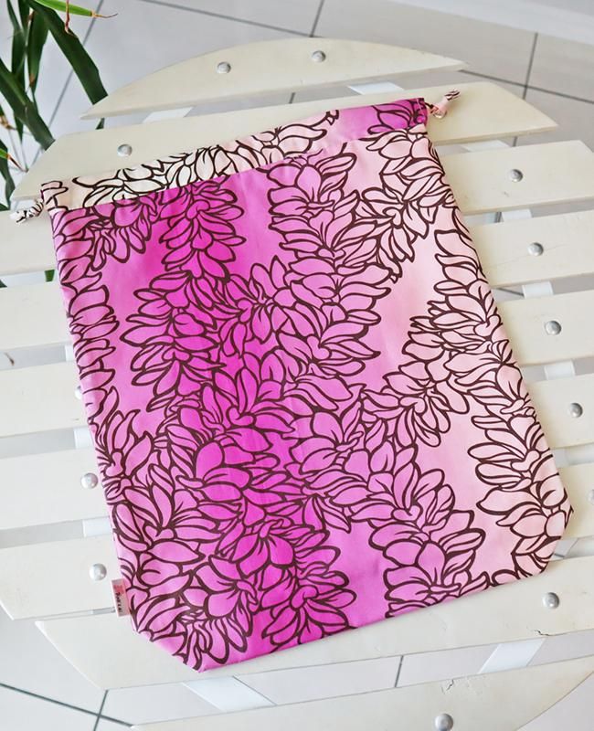 TOP > Pink Lei オリジナル 〜新商品〜 巾着袋 ピンクグラデーション・プルメリアレイ柄【1点もの】