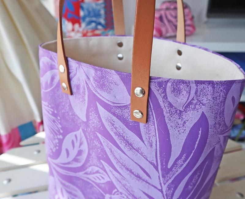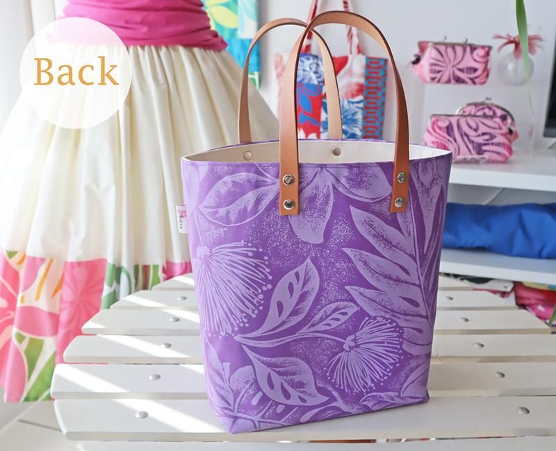 TOP > Pink Lei 【1点もの】ショッピングトートバッグ(帆布) パープル・プルメリア&リーフ柄