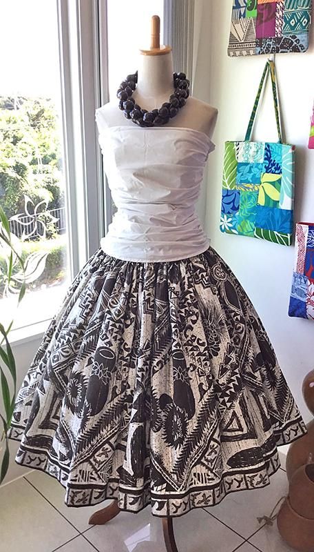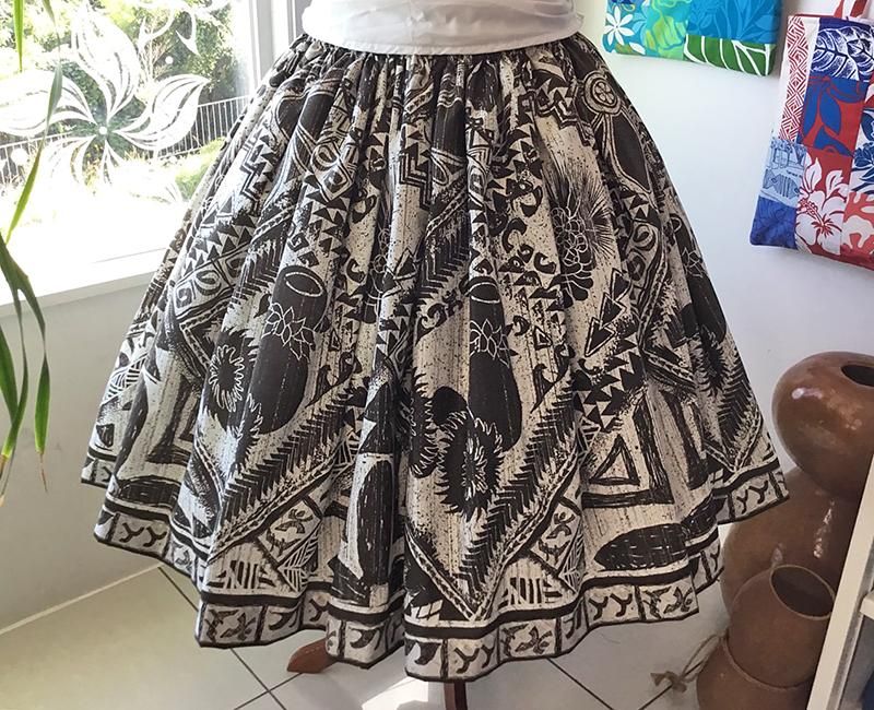 TOP > Pink Lei シングルパウ ホワイト&ダークブラウン・カヒコ柄(レフア・イプヘケ) ウエストゴム4本 丈73cm