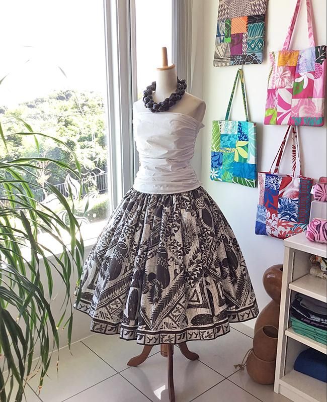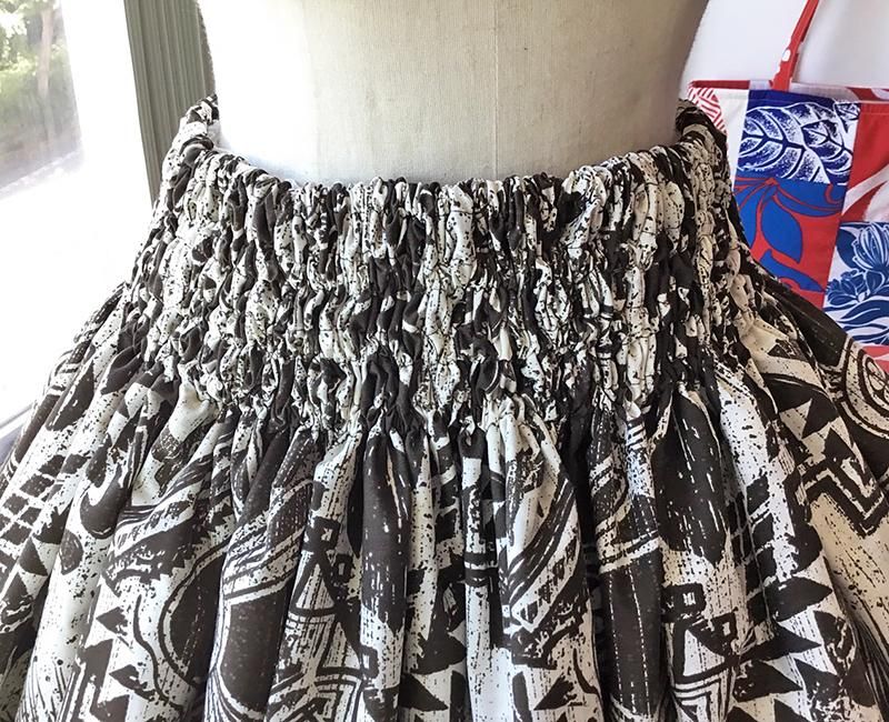 Pink Lei シングルパウ ホワイト&ダークブラウン・カヒコ柄(レフア・イプヘケ) ウエストゴム4本 丈73cm