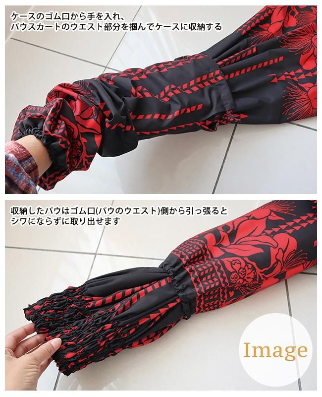 ケースのゴム口から手を入れ、パウのウエスト部分を掴んでケースに収納し、紐を絞ります。取り出す際にはゴム口側からパウを引っ張るとシワにならずにスムーズにスカートを取り出せます。(イメージ画像参考)