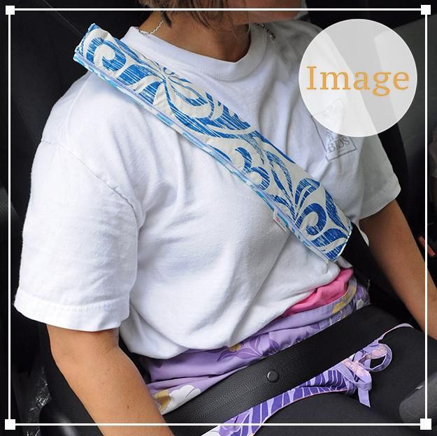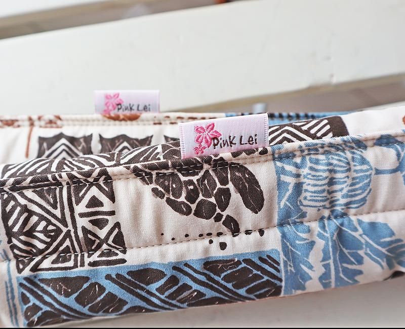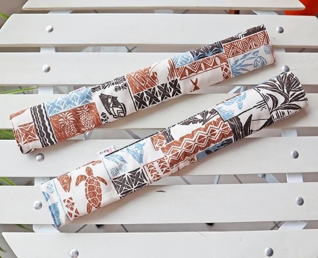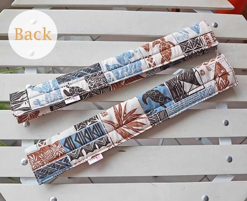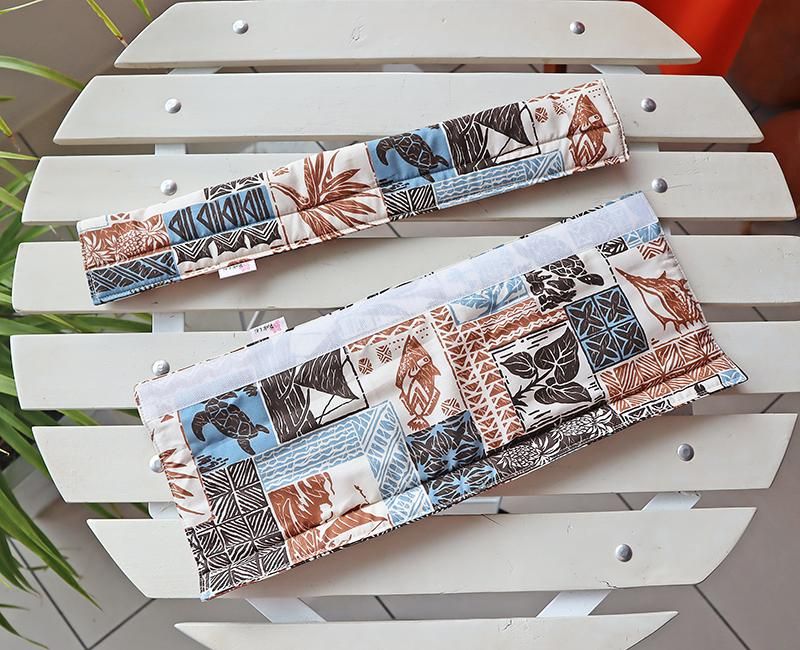 TOP > 〜Pink Lei オリジナル〜 シートベルトカバー オフホワイト&ブラウン&ブルー・ハワイアンモチーフ柄【1点もの】