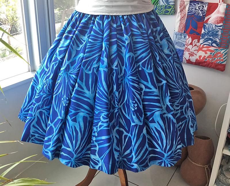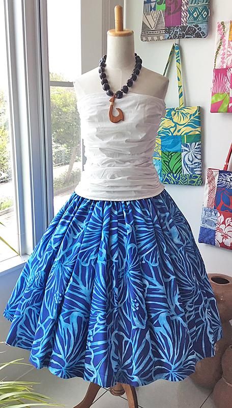 TOP > 【既製】Pink Lei シングルパウ ブルー・ハイビスカス総柄 ウエストゴム4本 丈73cm(ギャザーあり)
