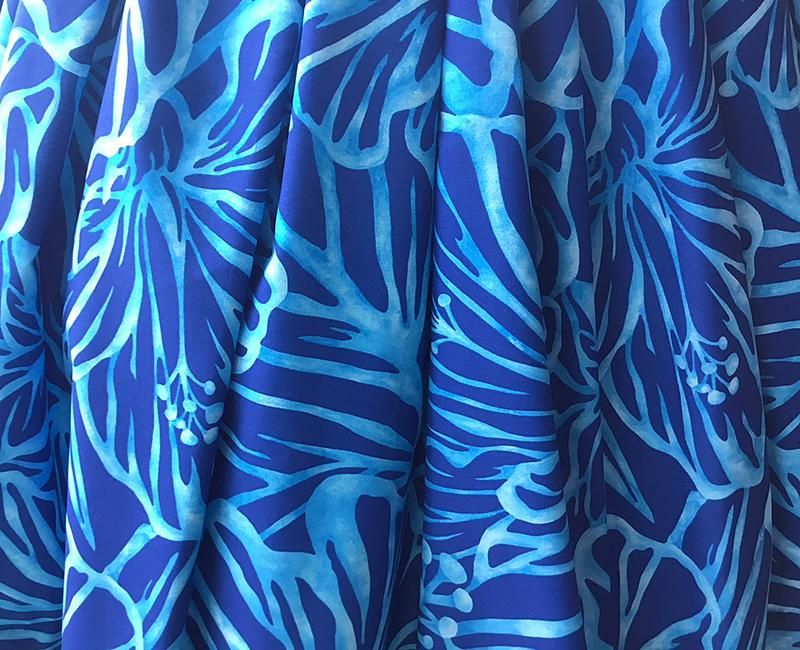 深みのあるブルーが印象的なパウスカートです。ハイビスカスが全体に大きく描かれ、白トップスがよく似合う上品なデザインです。