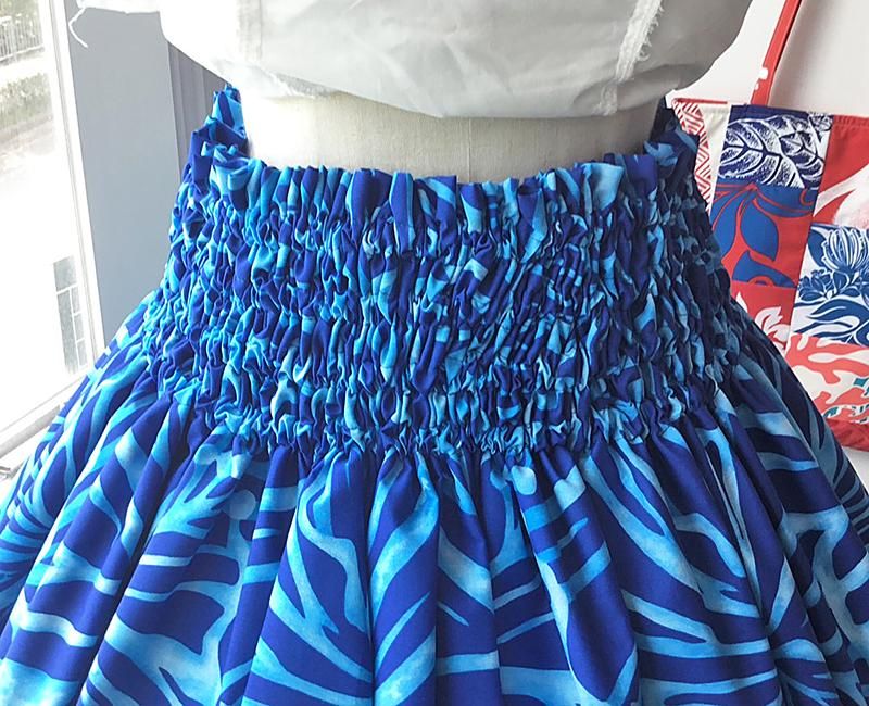 【既製】Pink Lei シングルパウ ブルー・ハイビスカス総柄 ウエストゴム4本 丈73cm(ギャザーあり)