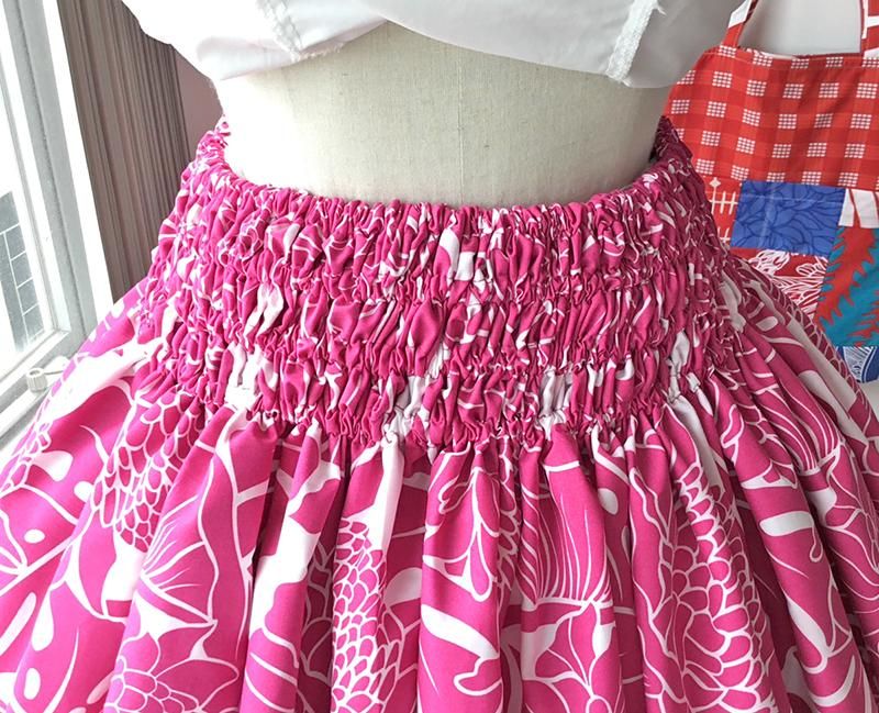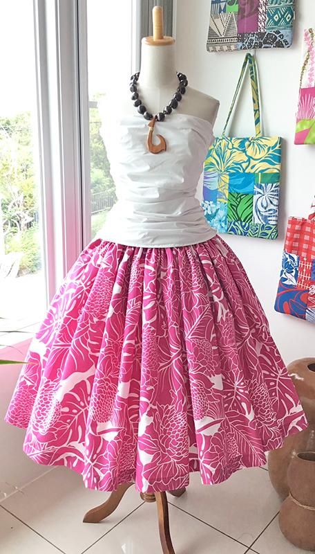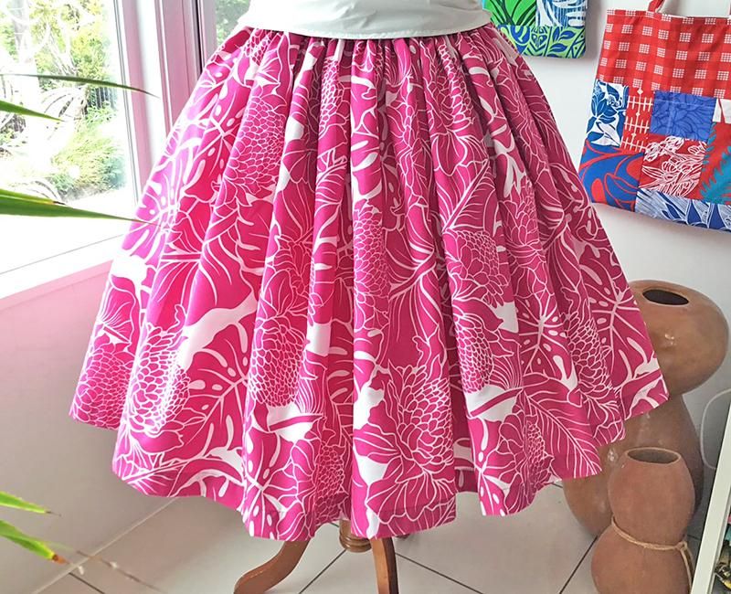 TOP > Pink Lei シングルパウ ローズ&ホワイト・トーチジンジャーフラワー&モンステラ柄 ウエストゴム4本 丈73cm