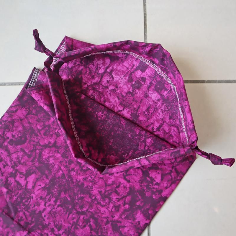 ケースのゴム口から手を入れ、パウのウエスト部分を掴んでケースに収納し、紐を絞ります。取り出す際にはゴム口側からパウを引っ張るとシワにならずにスムーズにスカートを取り出せます。(イメージ画像参考)