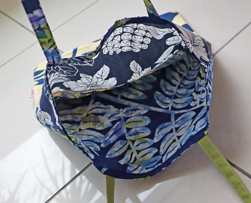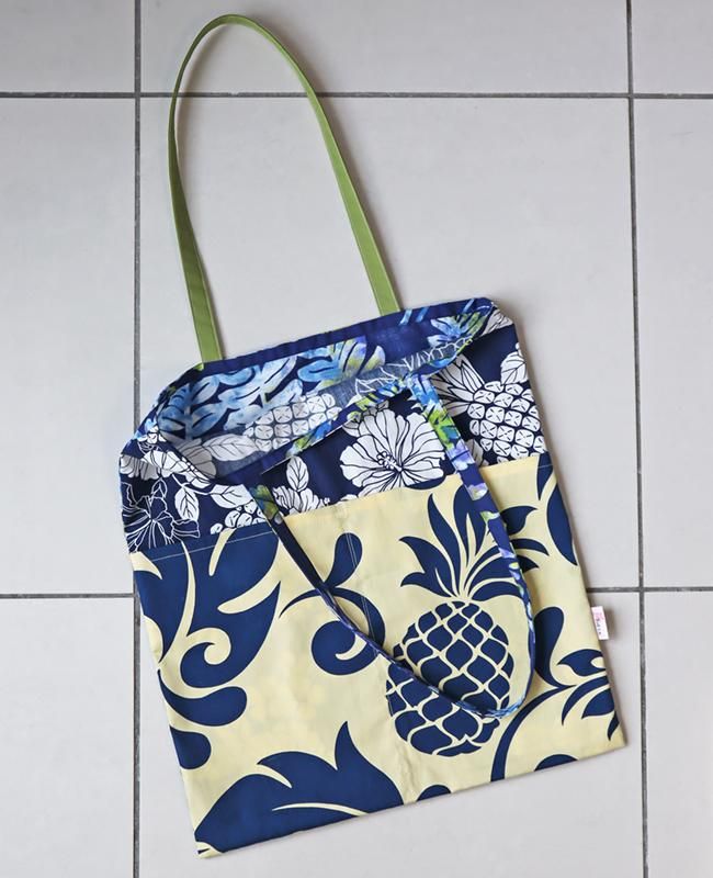 TOP > 【新商品】A4ハワイアンファブリックバッグ ブルー&クリームイエロー&グリーン・パイナップル&シダ柄【1点もの】