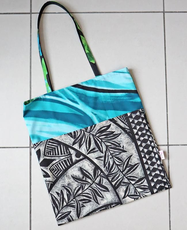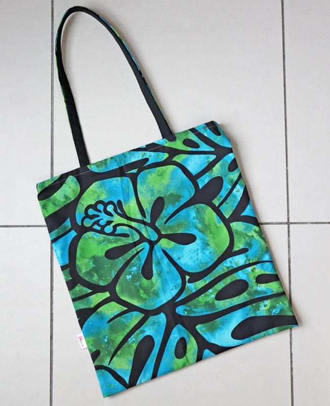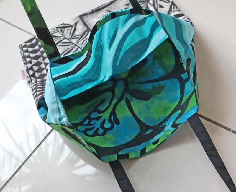 TOP > 【新商品】A4ハワイアンファブリックバッグ ブルー&ブラック&グリーン・古典&ハイビスカス柄【1点もの】