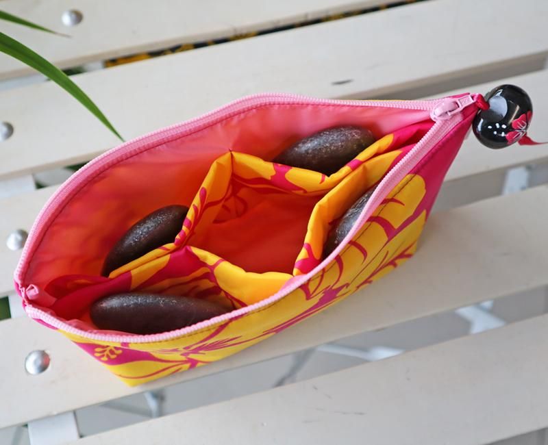 重くてかたい石(イリイリ)を収納することを考え、厚めのクッションでポーチの内側を4つに仕切って作りました。ハンドタオルやハンカチを一緒に収納できるのもうれしい。フラガールのマストアイテムです!