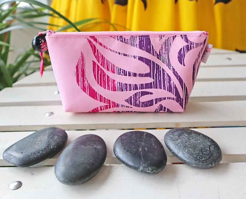 重くてかたい石(イリイリ)を収納することを考え、厚めのクッションでポーチの内側を4つに仕切って作りました。ハンドタオルやハンカチを一緒に収納できるのもうれしい。フラガールのマストアイテムです!