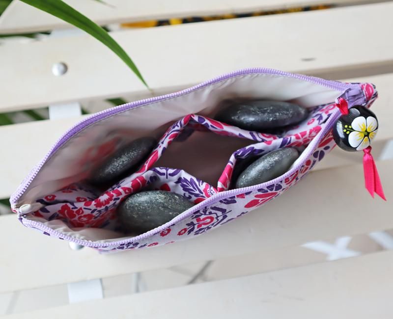 重くてかたい石(イリイリ)を収納することを考え、厚めのクッションでポーチの内側を4つに仕切って作りました。ハンドタオルやハンカチを一緒に収納できるのもうれしい。フラガールのマストアイテムです!