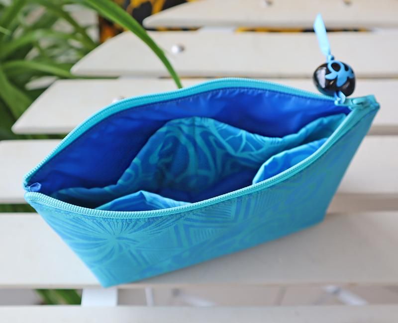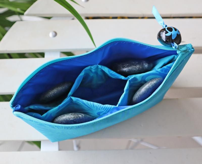 重くてかたい石(イリイリ)を収納することを考え、厚めのクッションでポーチの内側を4つに仕切って作りました。ハンドタオルやハンカチを一緒に収納できるのもうれしい。フラガールのマストアイテムです!