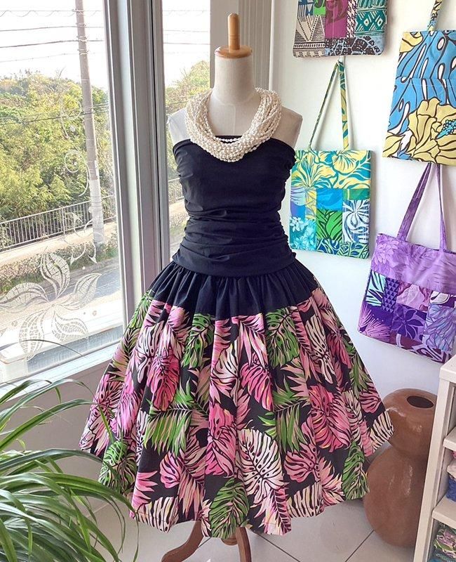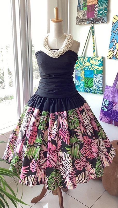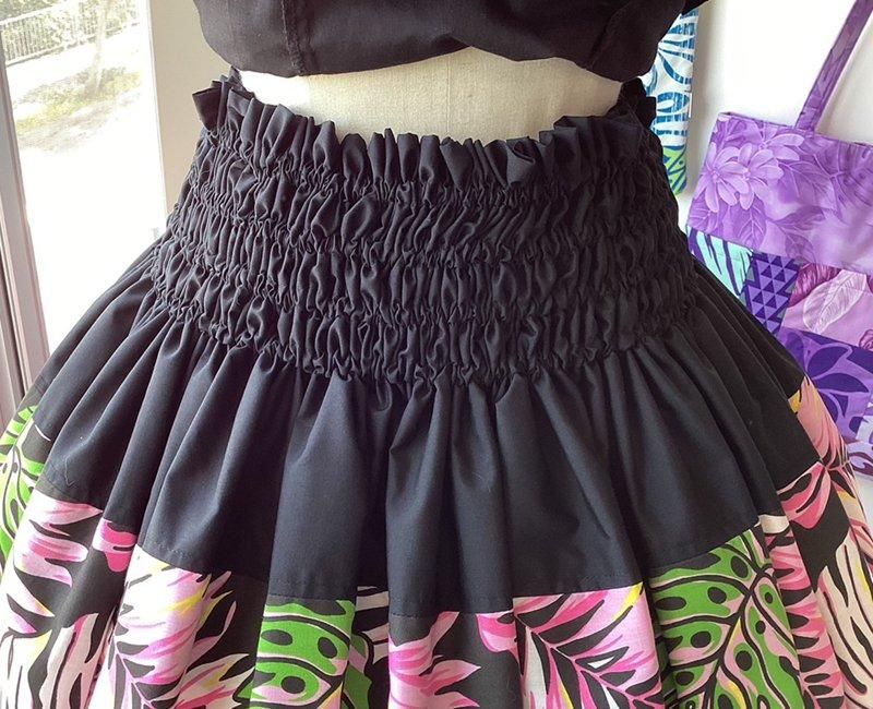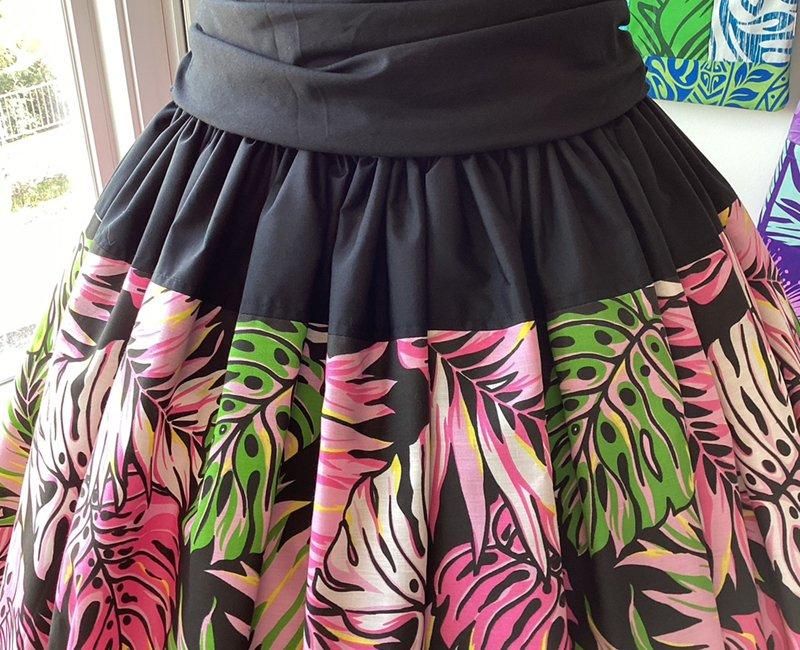 TOP > Pink Lei シングルパウ ブラック&ピンク&グリーン・トロピカルリーフ(切り替え)柄 ウエストゴム4本 丈73cm