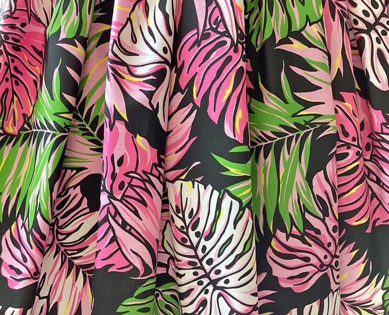Pink Lei シングルパウ ブラック&ピンク&グリーン・トロピカルリーフ(切り替え)柄 ウエストゴム4本 丈73cm