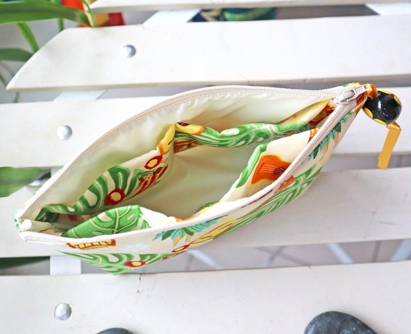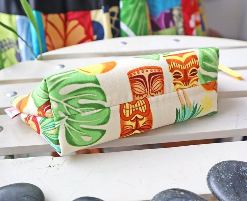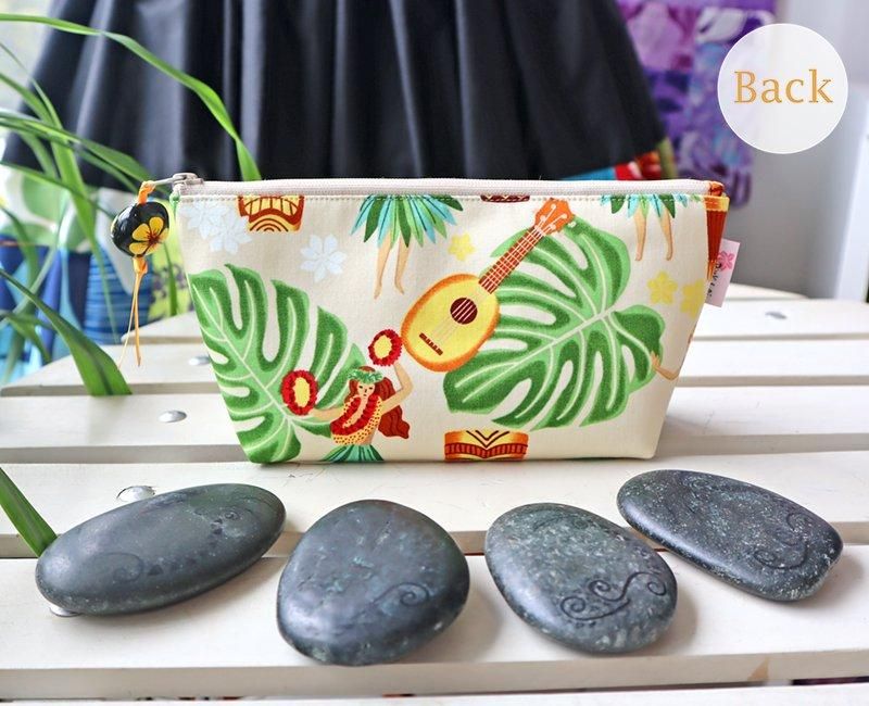 TOP > Pink lei オリジナル【1点もの】イリイリケース オフホワイト&グリーン&イエロー・フラガール&ティキ&楽器柄