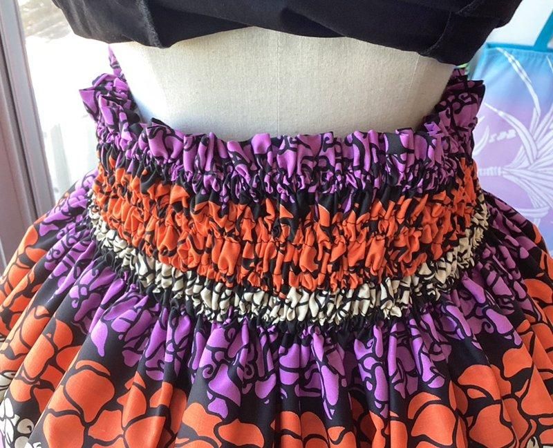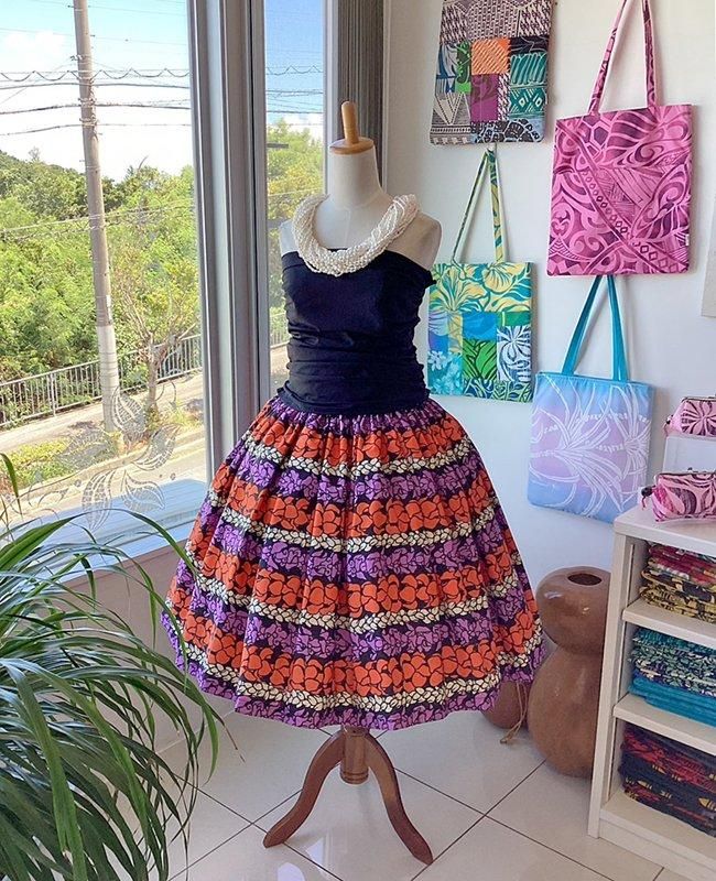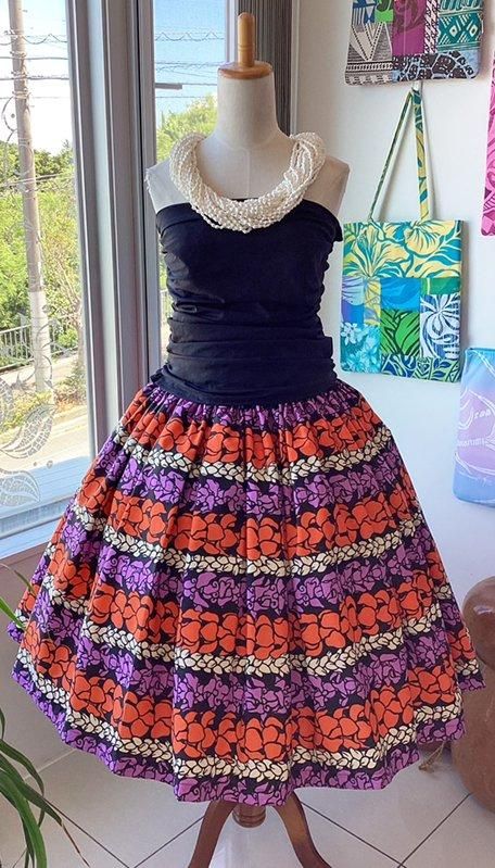 TOP > Pink Lei シングルパウ オレンジ&パープル&ホワイト・レイボーダー柄 ウエストゴム4本 丈73cm