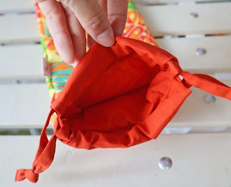 紐を引っ張ってキュッと口を閉じたあと、紐に手首を通しての持ち運びが可能です。