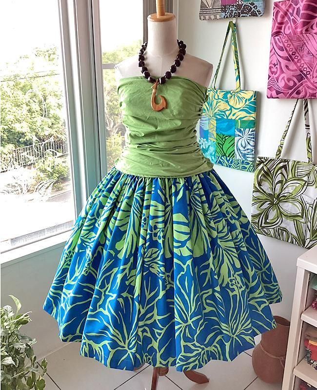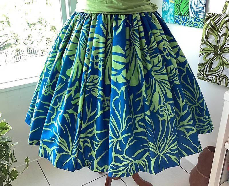 TOP > パウスカート > 【既製・一点もの】Pink Lei シングルパウ ライム&ロイヤルブルー・ハイビスカス柄 ウエストゴム4本 丈73cm【1点もの】