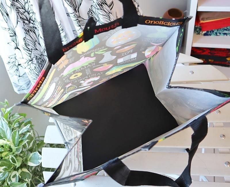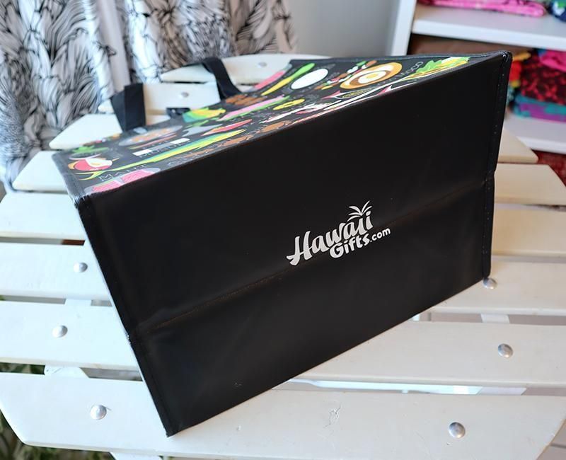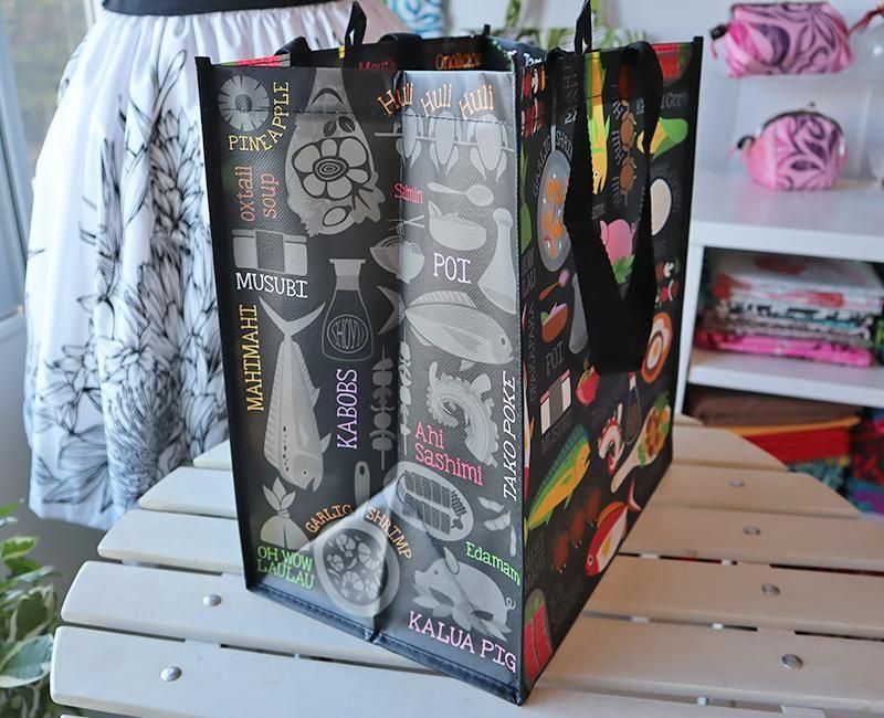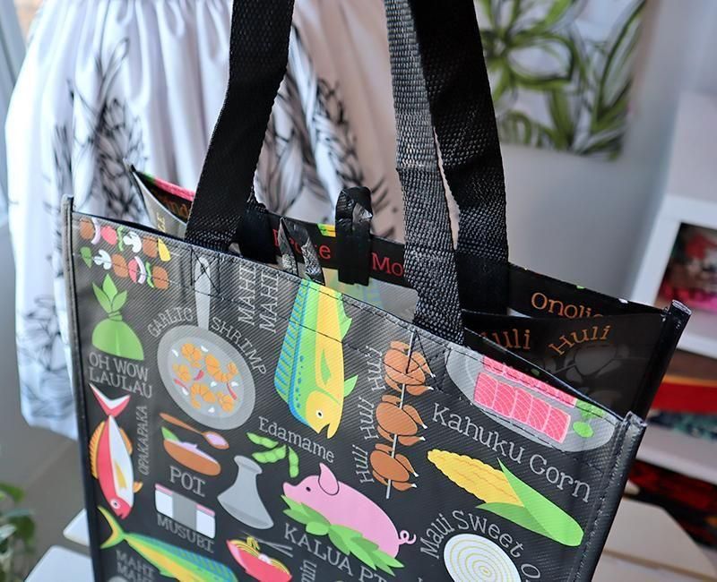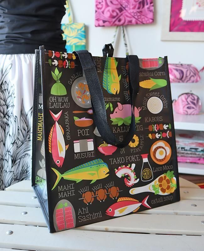 普段の買い物にピッタリのサイズ感で、ハワイの料理にちなんだイラストとロゴのポップな柄が可愛いデザインです。