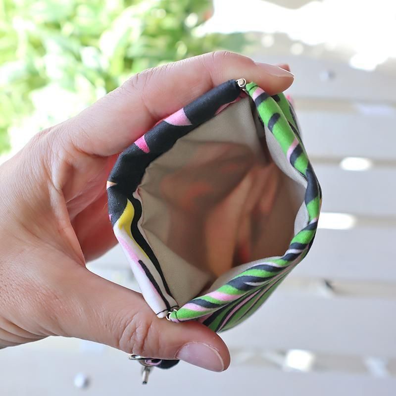 開口幅(約9.5cm)はマグネット仕様になっていて、しっかり閉じて中身がすべり落ちるのを防ぎます。また、生地には中綿を入れて厚みをもたせ、柔らかい触り心地に仕上げたのもこだわりの一つ。