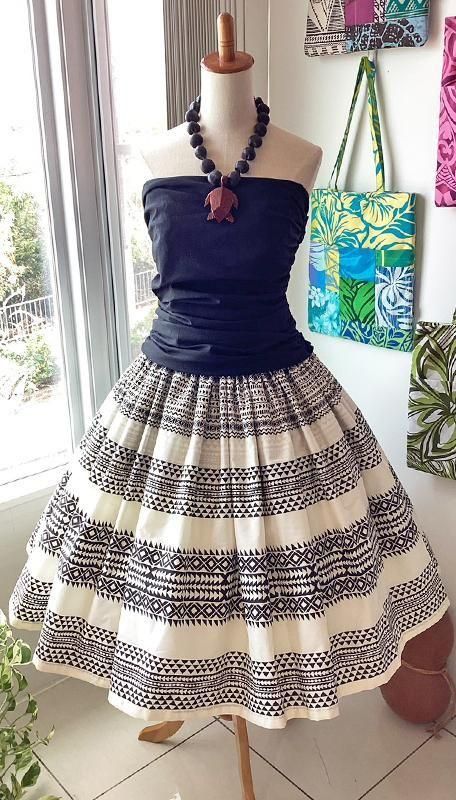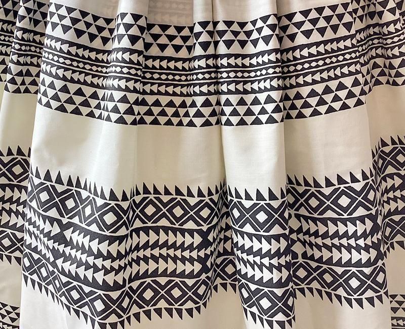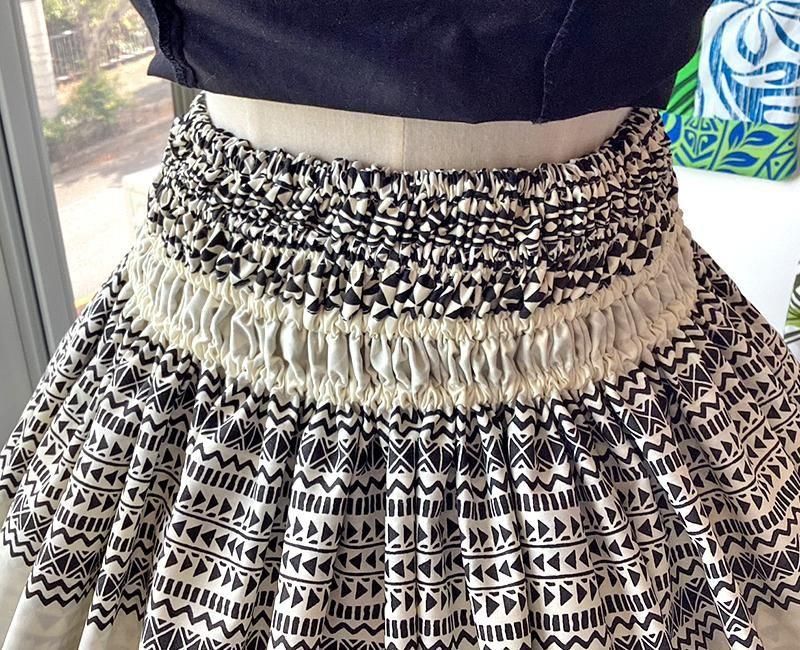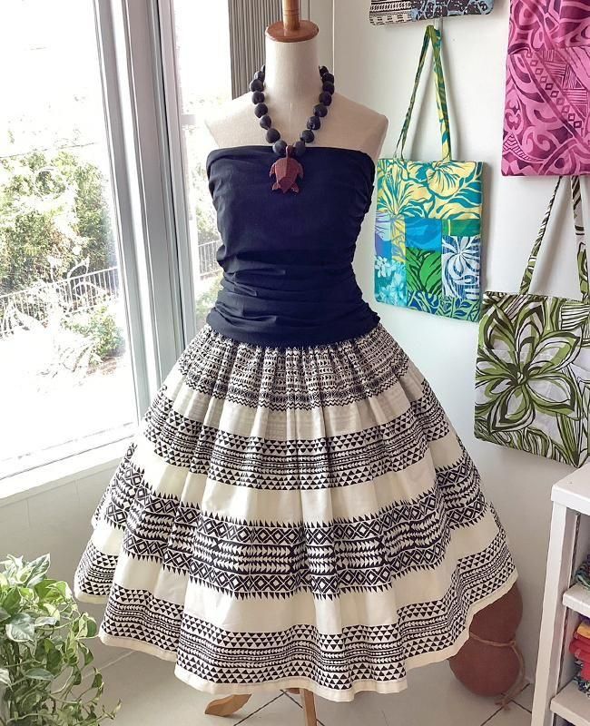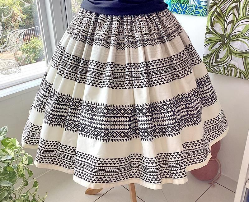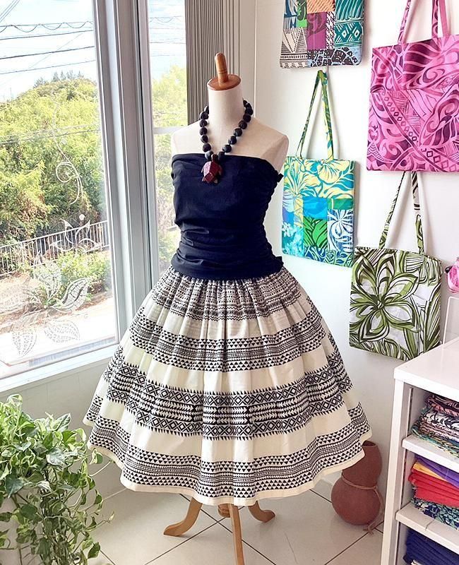 TOP > パウスカート > Pink Lei シングルパウ ブラック&アイボリー・カヒコ(古典)ボーダー柄 ウエストゴム4本 丈73cm