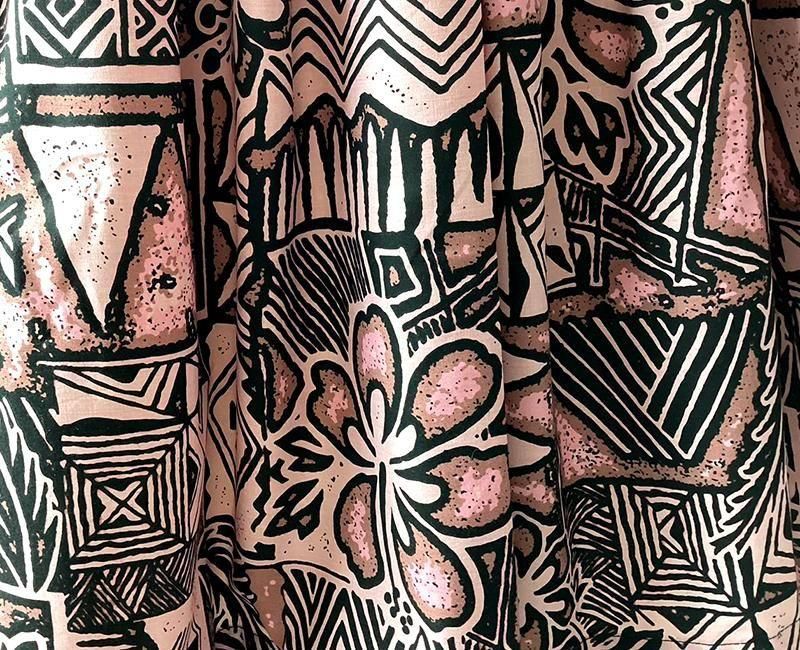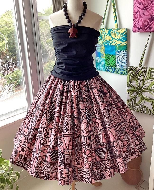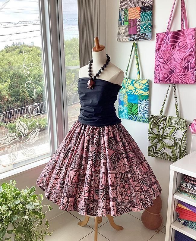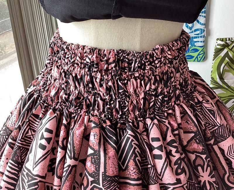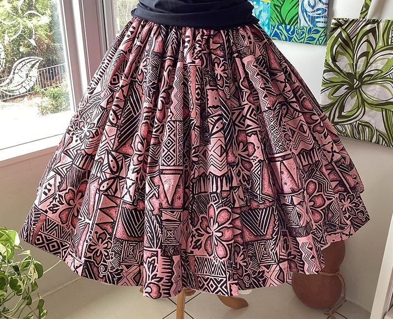 TOP > パウスカート > Pink Lei シングルパウ ピンク&ブラック・ハイビスカス&カヒコ(古典)柄 ウエストゴム4本 丈73cm