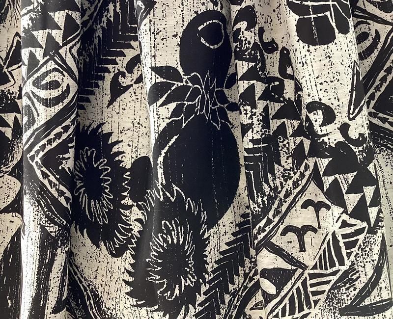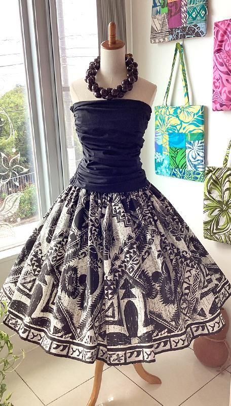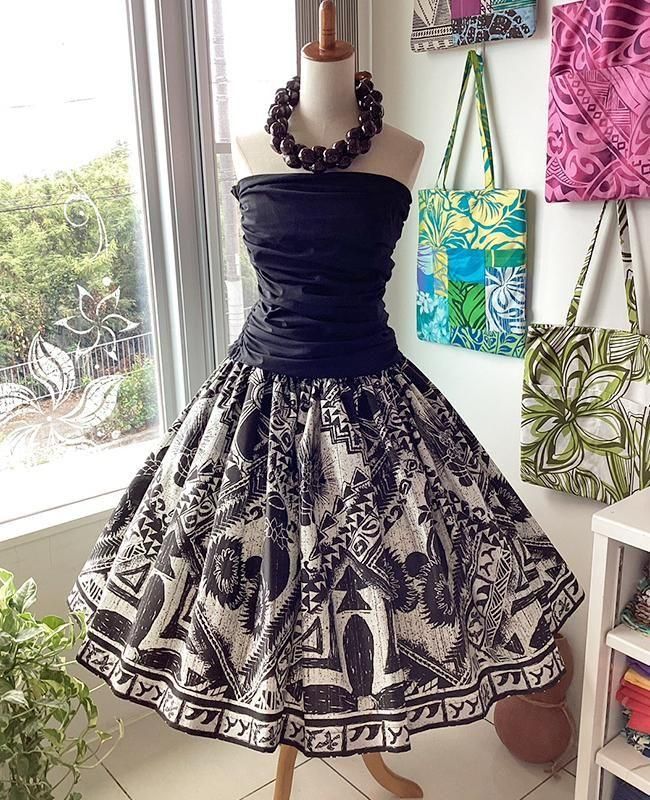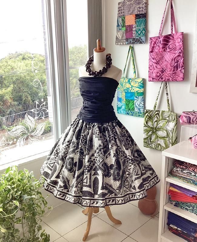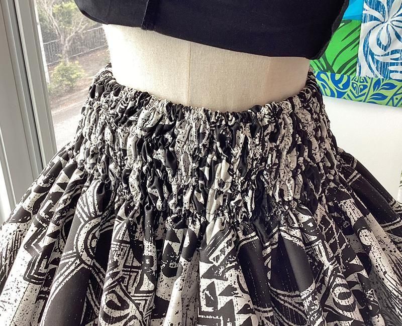 TOP > パウスカート > Pink Lei シングルパウ ブラック&ホワイト・楽器&カヒコ(古典)柄 ウエストゴム4本 丈73cm