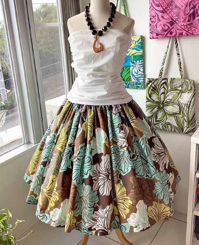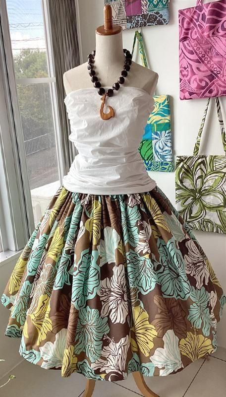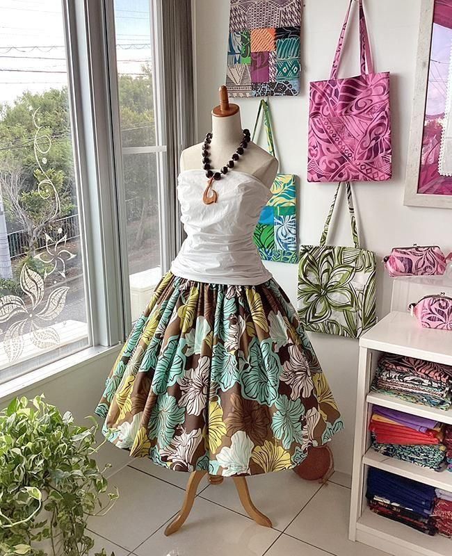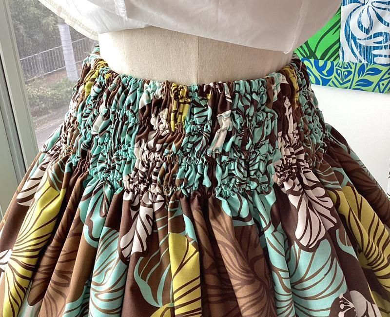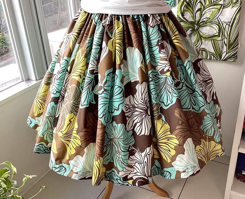 TOP > パウスカート > Pink Lei シングルパウ ブラウン&ミント&イエロー・ハイビスカス総柄 ウエストゴム4本 丈73cm