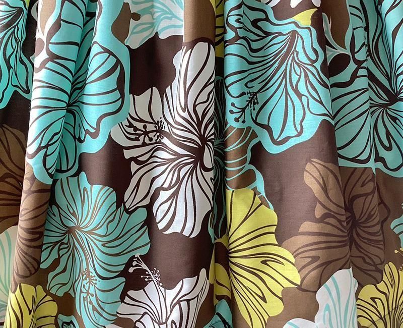 Pink Lei シングルパウ ブラウン&ミント&イエロー・ハイビスカス総柄 ウエストゴム4本 丈73cm