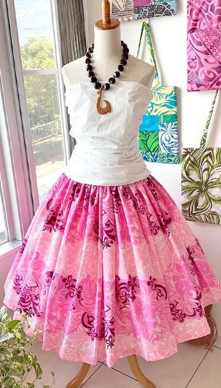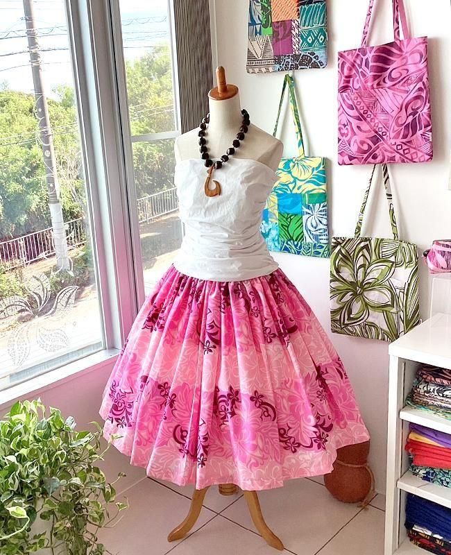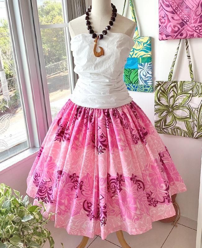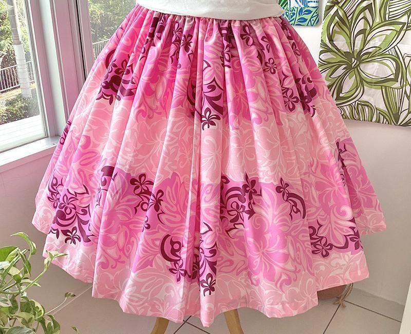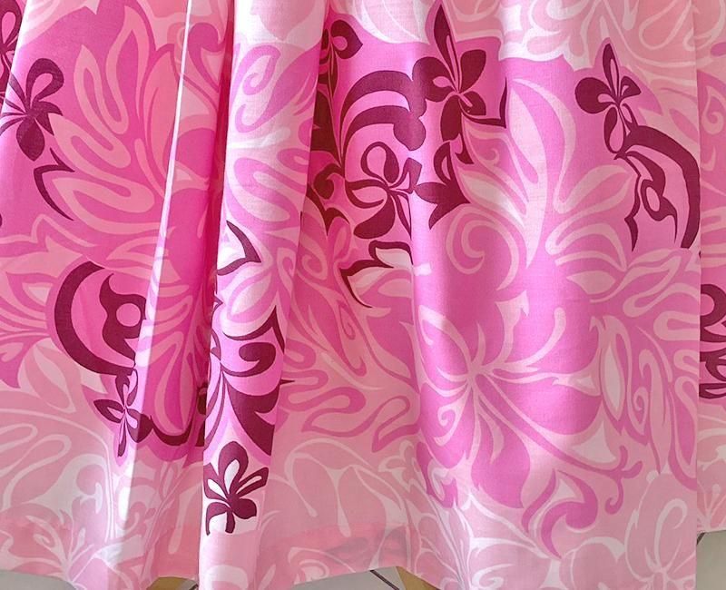 TOP > パウスカート > 【既製・一点もの】Pink Lei シングルパウ ピンク・ハイビスカス&リーフ柄 ウエストゴム4本 丈73cm【1点もの】