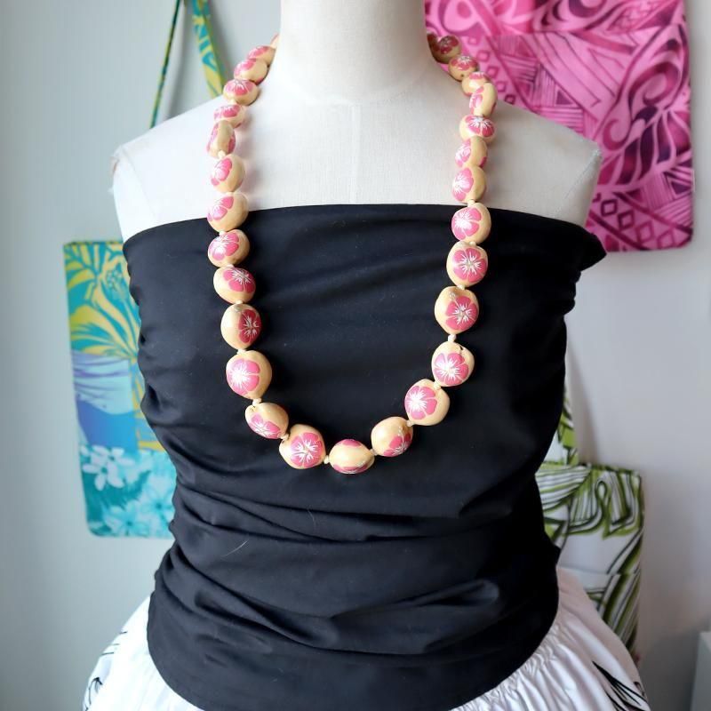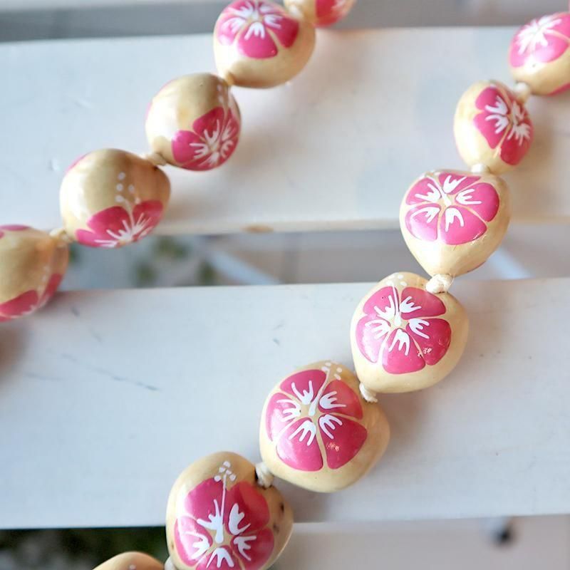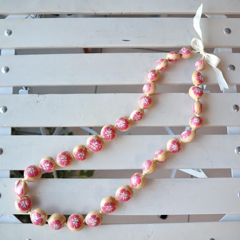 TOP > ククイネックレス > Pink Lei ククイネックレス ホワイト&ピンク/ハイビスカス柄【1点もの】