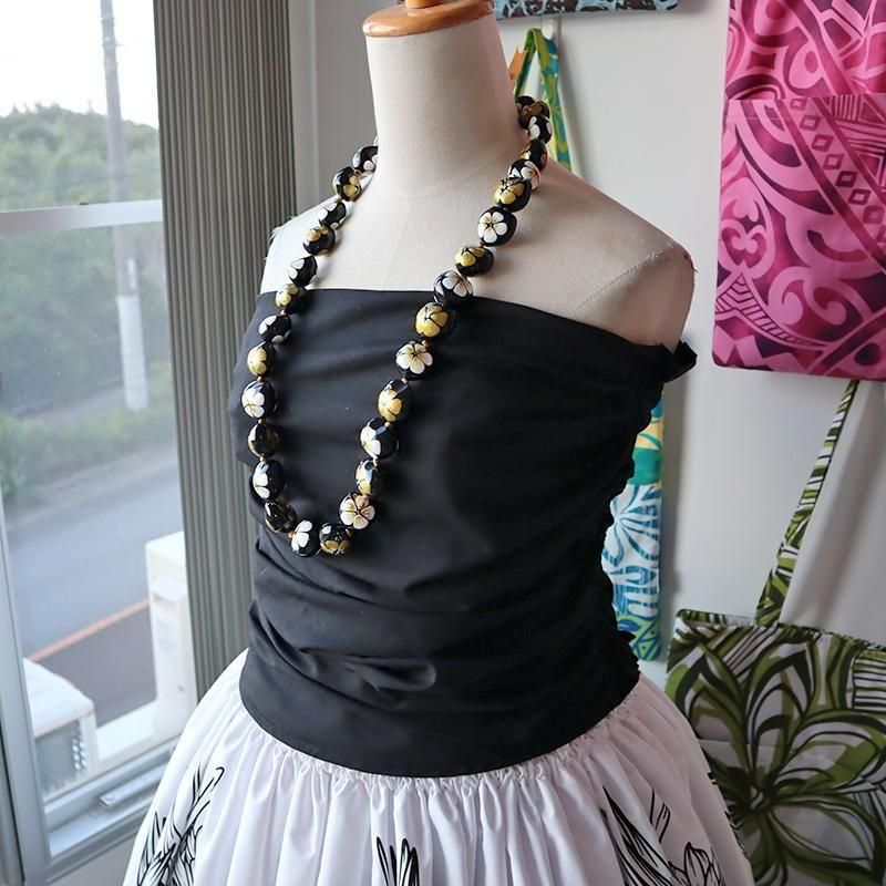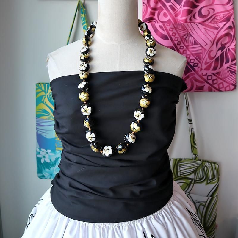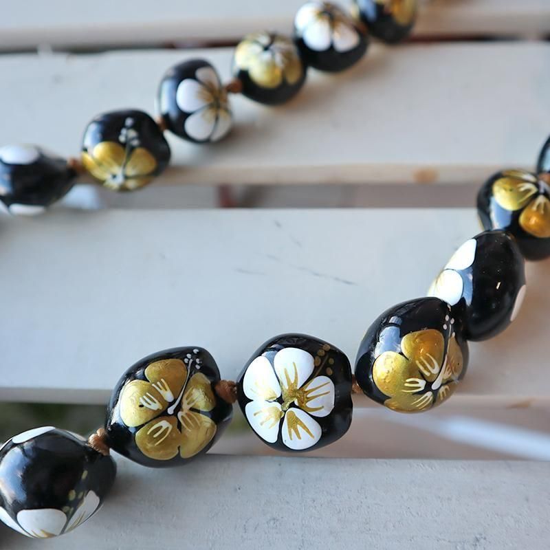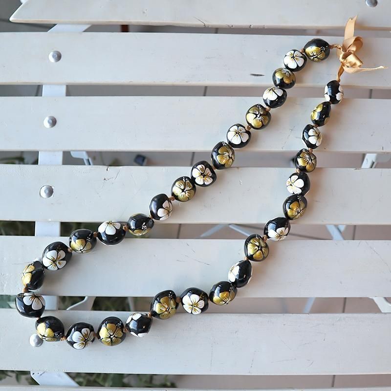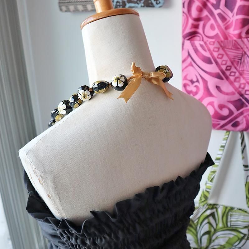 TOP > ククイネックレス > Pink Lei ククイネックレス ブラック&ホワイト&ゴールド/ハイビスカス柄【1点もの】