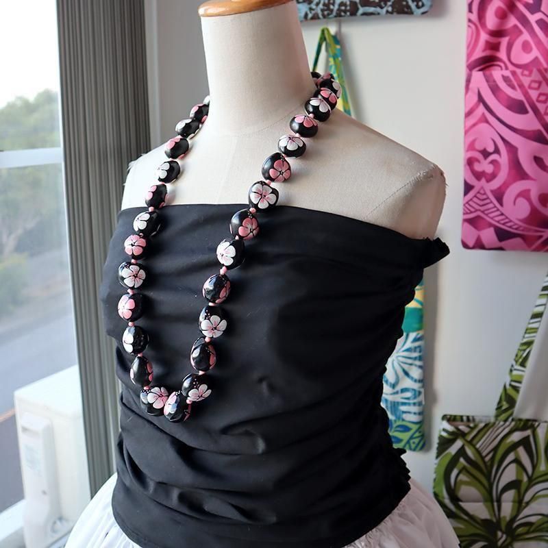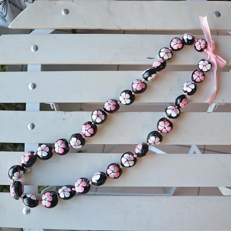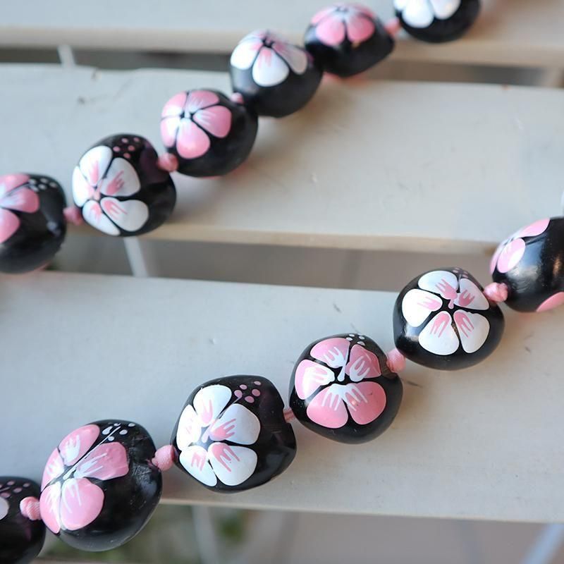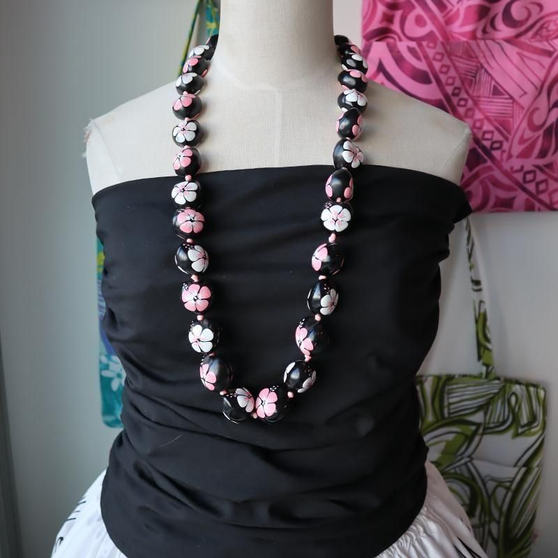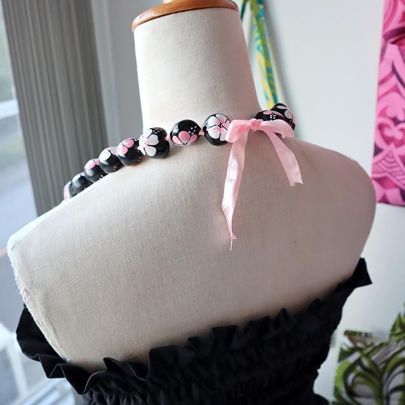 TOP > ククイネックレス > Pink Lei ククイネックレス ブラック&ホワイト&ピンク/ハイビスカス柄【1点もの】