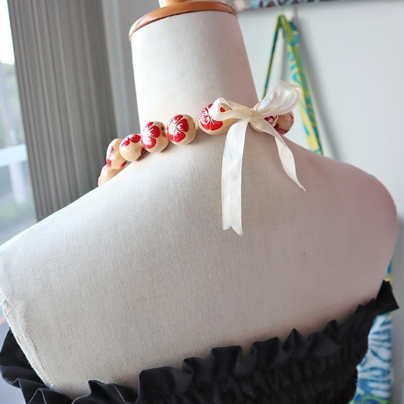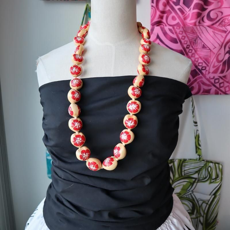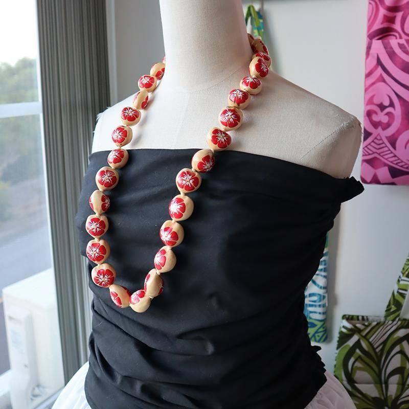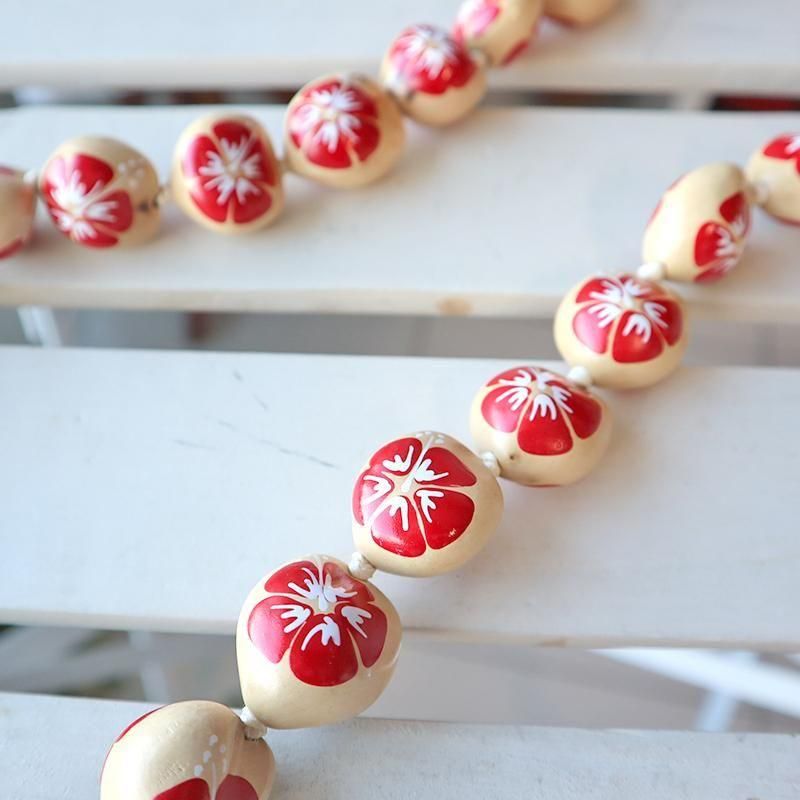 Pink Lei ククイネックレス ホワイト&レッド/ハイビスカス柄【1点もの】