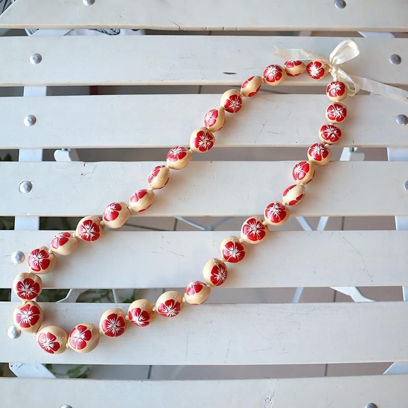 TOP > ククイネックレス > Pink Lei ククイネックレス ホワイト&レッド/ハイビスカス柄【1点もの】