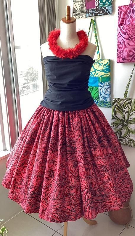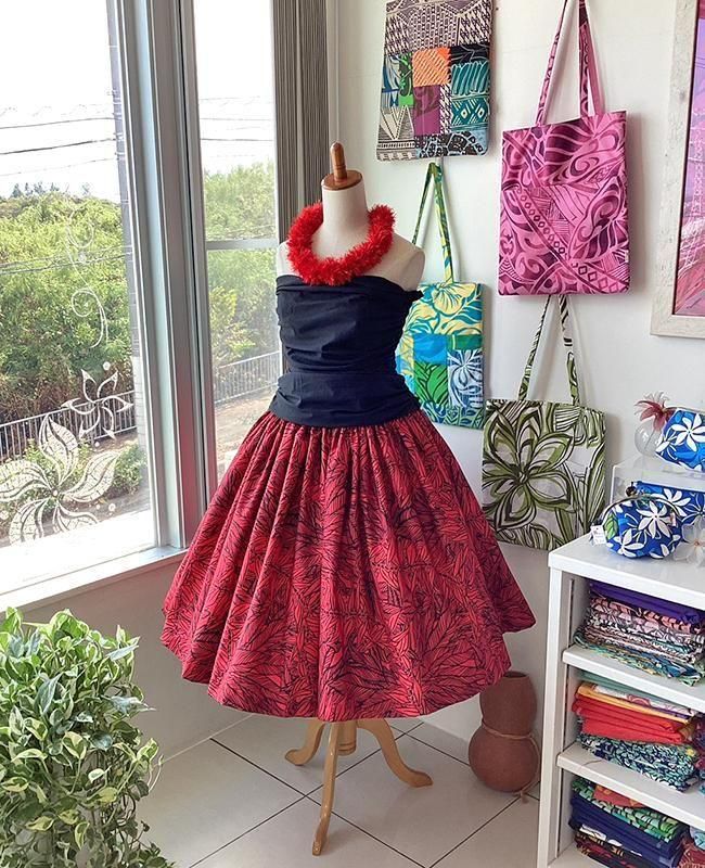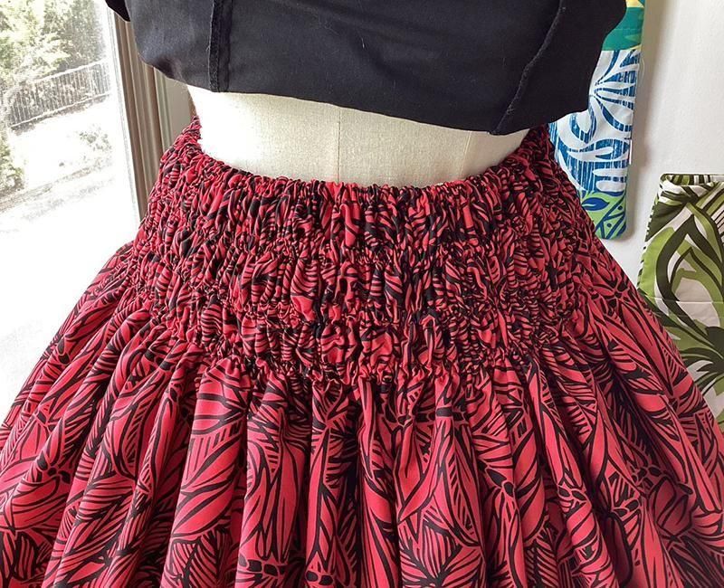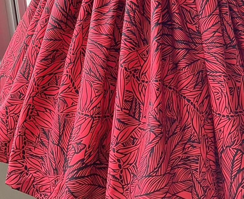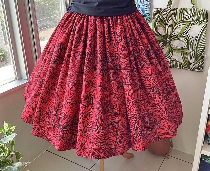 TOP > パウスカート > Pink Lei シングルパウ レッド&ブラック・ティーリーフ総柄 ウエストゴム4本 丈73cm